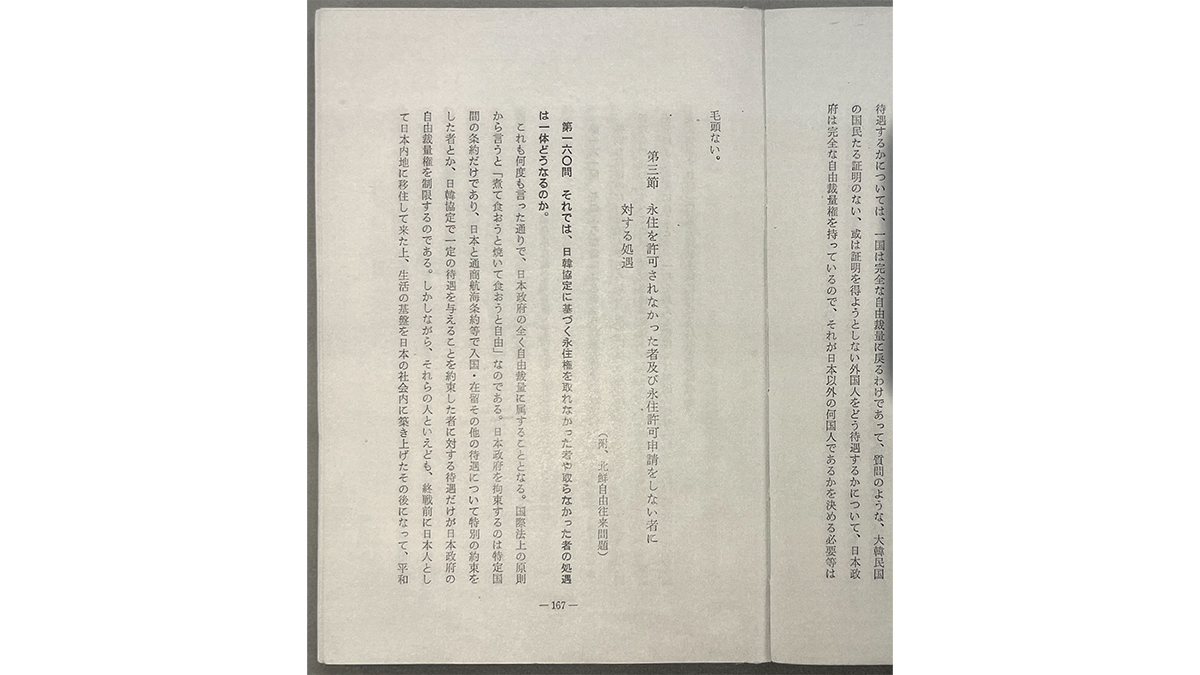 自分は宮崎繁樹『出入国管理──現代の「鎖国」』(三省堂新書、1970年)において、にわかには信じがたい文言が引かれている箇所に出くわし、その出典をあたった。法務省入国管理局の検事(のちに検事正まで出世している)が、1965年に「日韓協定に基づく永住権を取れなかった者や取らなかった者の処遇はどうなるのか?」という質問に対して、次のように回答している。