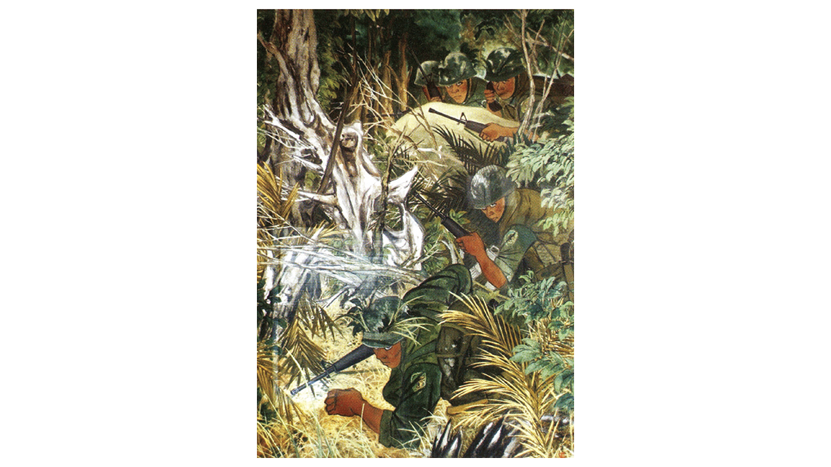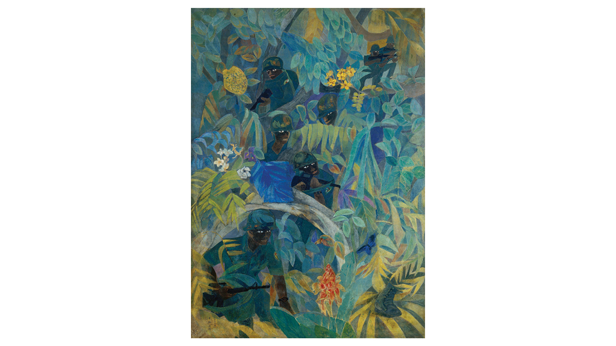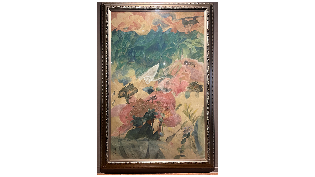 1970年が「ベトナム戦争」期であったという視点から考えるならば、異なる「戦争画」が姿をあらわす。ベトナムに従軍した韓国の作家のなかに、チョン・キョンジャ(千鏡子、1924–2015)がいる[5]。「戦前」──太平洋戦争のことだ──、東京女子美術専門学校(現・女子美術大学)に「留学」[6]した経歴をもつキョンジャは、1972年6月にベトナムを訪れている。現地では、ヘリに乗って戦闘の前線に赴いたり、暑いなかわざわざ防弾チョッキを着用してポーズをとる兵士たちや、鮮やかな花をスケッチしたりするなど、かなり積極的に、かつ前向きに、活動をしていたようである[7]。国立現代美術館での「越南戦記録展示会」は同年12月の開催であったため、従軍画家たちは帰国後すぐさま制作にとりかからなければならないタイトなスケジュールであった。そのような制作条件下においても、キョンジャは現地のスケッチ群を元手に自身のフィルターを通して取材先のジャングルを描き楽しんだようで、画面には他の従軍画家たちには見られない物語的世界が構築されている。