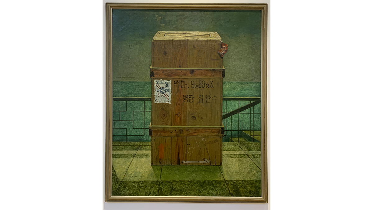 当時、従軍画家たちには最低でも2枚の絵画制作が要請されており、彼女が発表したのは《花と兵士と砲声》や《目標》であった[8]。たしかに、狭義の「戦争画」のなかでは、印象に残る絵ではある。しかし自分は、もっと奇妙な絵を、釜山市立美術館で観たことがあった[9]。今回はそちらのほうに舵を切りたい。チェ・ジョンテ(1932–1978)による「木箱」の絵である。