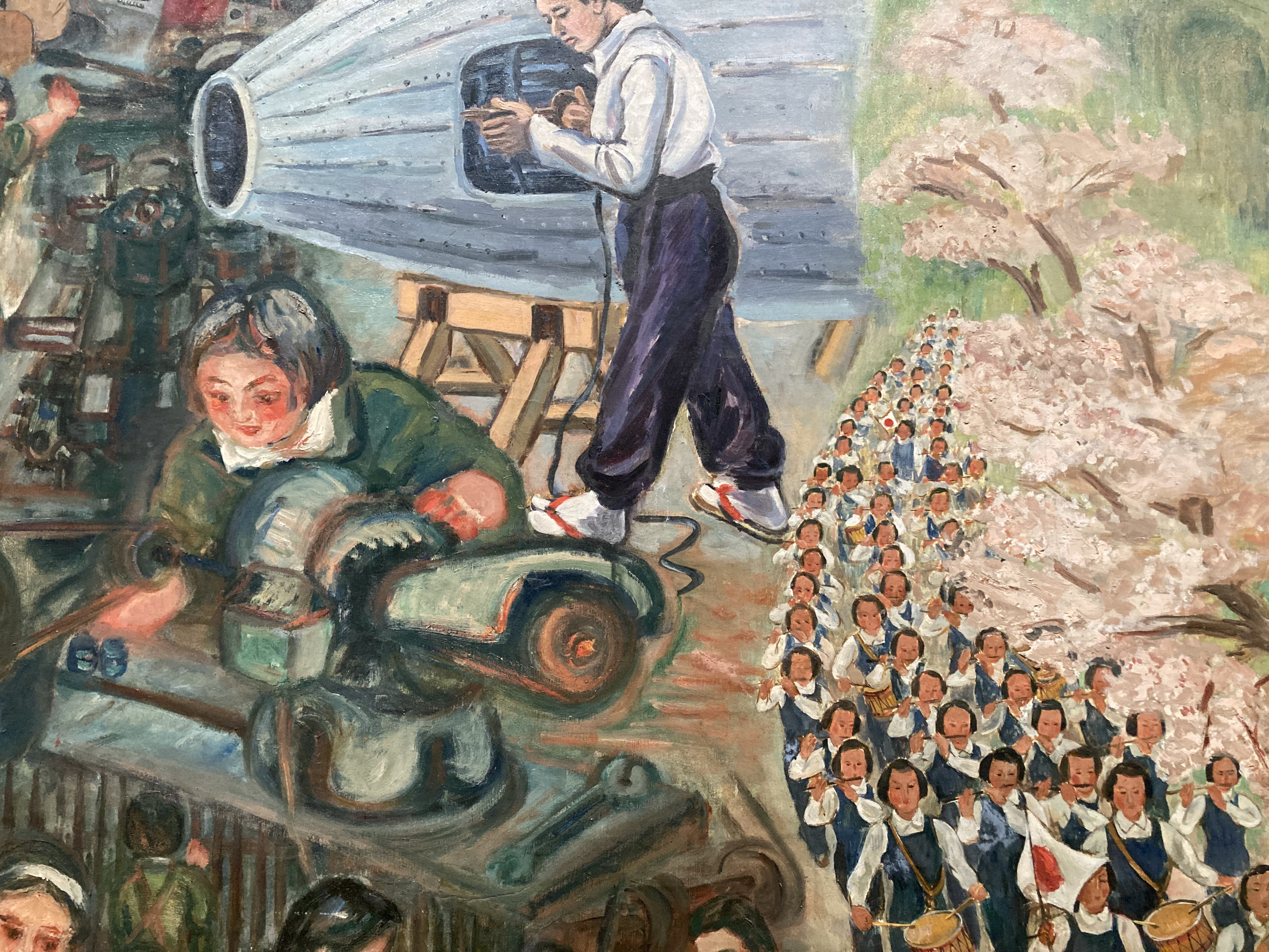 結果として、個別の場面は写真を忠実に再現するリアリズムに基づきながらも、三次元的な空間が複数並存することによる、ほとんど超現実的な空間が現れることになる。その奇妙さは、とりわけ複数の場面の接合部に見られる。「春夏の部」の画面中央で旋盤を動かす工場には、飛行機とそれを整備する女性が闖入し、その女性の足元を掠めるように、画面中央奥から手前へと列をなして行進が行われる(図4)。「秋冬の部」では、画面中央上部で靖国神社で神酒を手にする従軍看護婦の姿が大きく描かれ、右下には戦闘機の翼に羽布を縫製する戦時労働が見られる。この戦闘機の翼を足場にするかのように金属を打ちつける鍛冶労働が描かれ、あたかも翼を屋根にするかのように理髪店が営まれている(図5)。