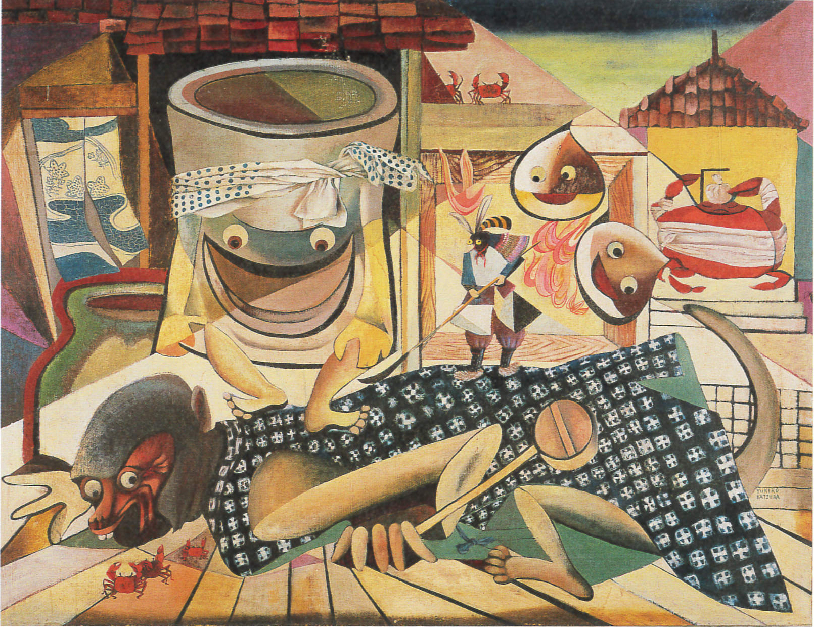 狡猾な猿が蟹を騙し、殺された蟹の子供から仕返しを受けるという単純な因果応報を表すこの寓話に対して、桂の翻案は、蟹による報復を過度に誇張することによって、寓話に別のニュアンスを与えている。(先の《賀象》でも見られた)紺色の絣のパターンが丹念に描き込まれた服をまとう猿の背中が踏みつけられ、猿の「被害」にこそシンパシーを置いているかのようでもある。猿の頭部には右上から光が差し込む一方で、その光線によってできた影が、猿の上で足を踏み締める臼の「笑顔」の不気味さを浮き彫りにしてもいる。