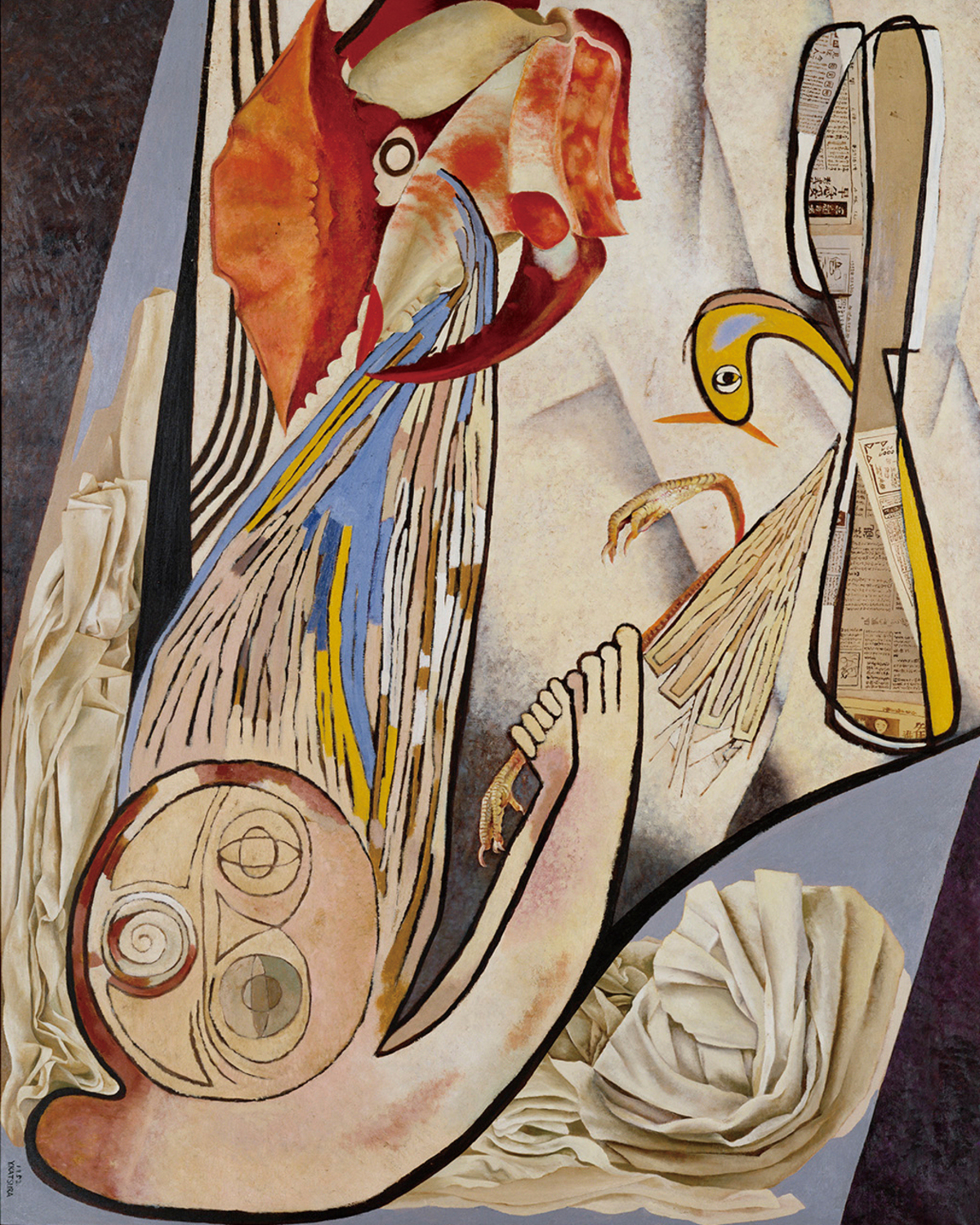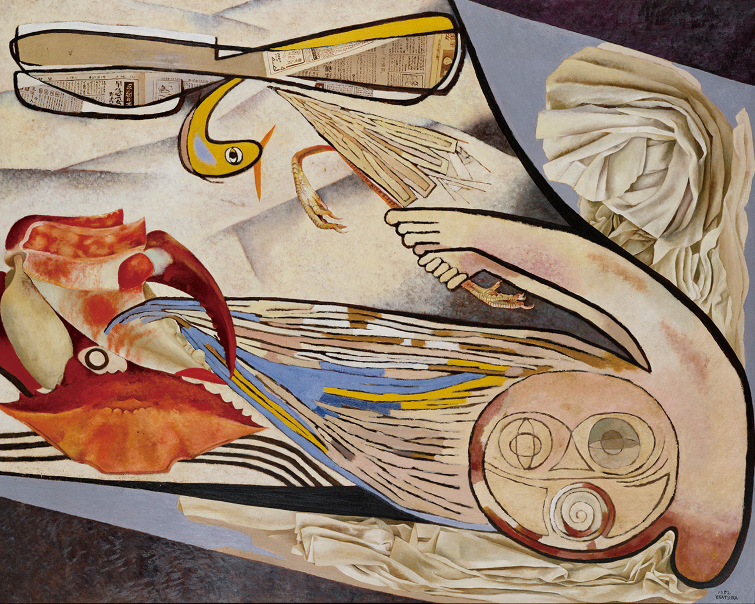 《抵抗》を見てみよう(図7)。眼光鋭く大きなはさみを露わにする蟹の存在は、《さるかに合戦》との関連を思わせるものでもあり、同様の戯画的な表現を汲んでいる。画面を大きく占めるのは、笑っているかのような顔と、その人物の髪の毛を引っ張る蟹。人物の両手は鳥の足を握りしめている。両手の先の鳥の羽には、本作の描かれた1952年の破壊活動防止法の成立を伝える新聞記事が覗いている。