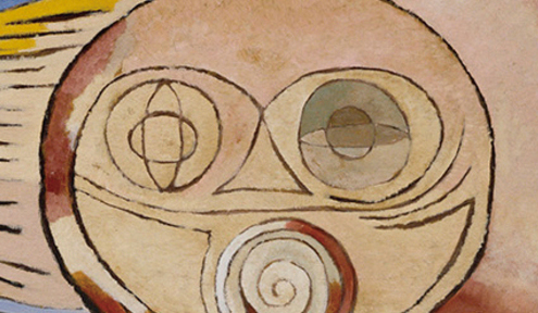 にもかかわらず本作には横構図を示すサインが記されており、キャンバスの回転を行うことによって、蟹に攻撃を受けながらの表情の矛盾は最大限に高められている。そこに英雄主義的な身振りを文字通り回転させることによって、「泣きながら笑い、笑いながら泣く」かのような、反語的な「抵抗」が現れている。同心円による両目の上に加えられた左右で縦横の方向の異なる楕円は、この作品の変転可能性こそを示すかのようでもある(図10)。