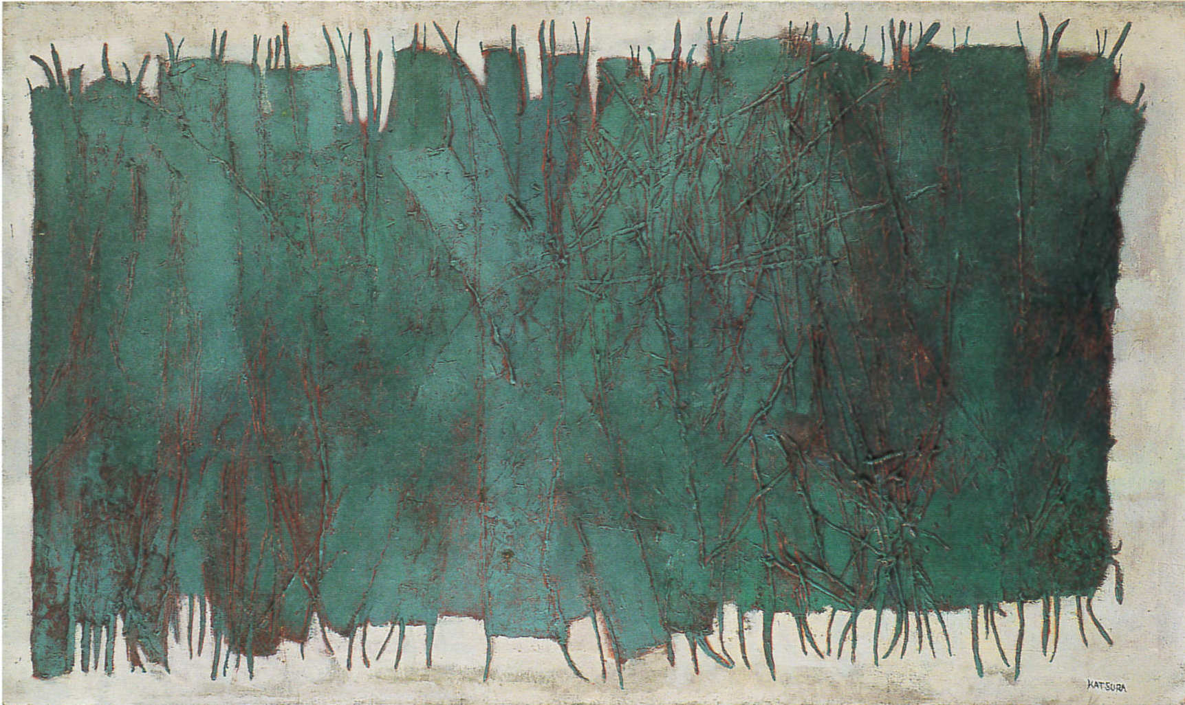 かのような、というのはキャンバスの上の色面のように見える帯は、絵具で描かれているのみならず、そこには和紙が貼り付けられているからである。和紙の皺のテクスチュアを生かしたその画面には、戦後アメリカの抽象絵画にみられる純粋な視覚性とは異なる、かつてのグチャグチャとした紙クズに通じる、猥雑さや物体性が残されてもいる。さらにその緑色の色面の周辺では、突起物が多く生え出しており、一見したところの大きな抽象的な色面は、害虫とみなされる千本足(ヤスデ)の巨大な体でもある。抽象でありながら抽象ではない、そうした反語的な逸脱がそこにはある。