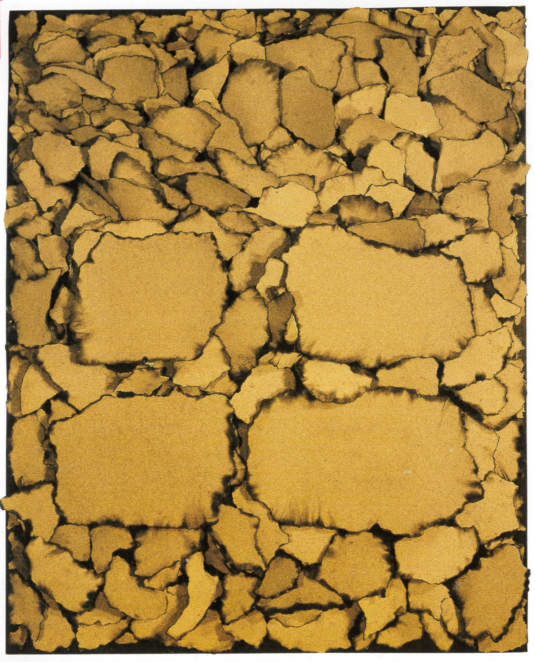 初期に手がけた作品を想起させるコルクによるコラージュだが、新たに取り組まれたそれは、大きな平面の集積によって戦後アメリカの抽象絵画を思わせるものでもあり、コルクを手でちぎり取ったような表情は、かつて描いた立ち上がる紙屑や「染み」、さらには女学生時代のモノクロ写真の再構成にまで通じているだろう。コルクそのものでありながら、同時にコルクでないものでもある、そうした多重性をもつ反語的コラージュである。