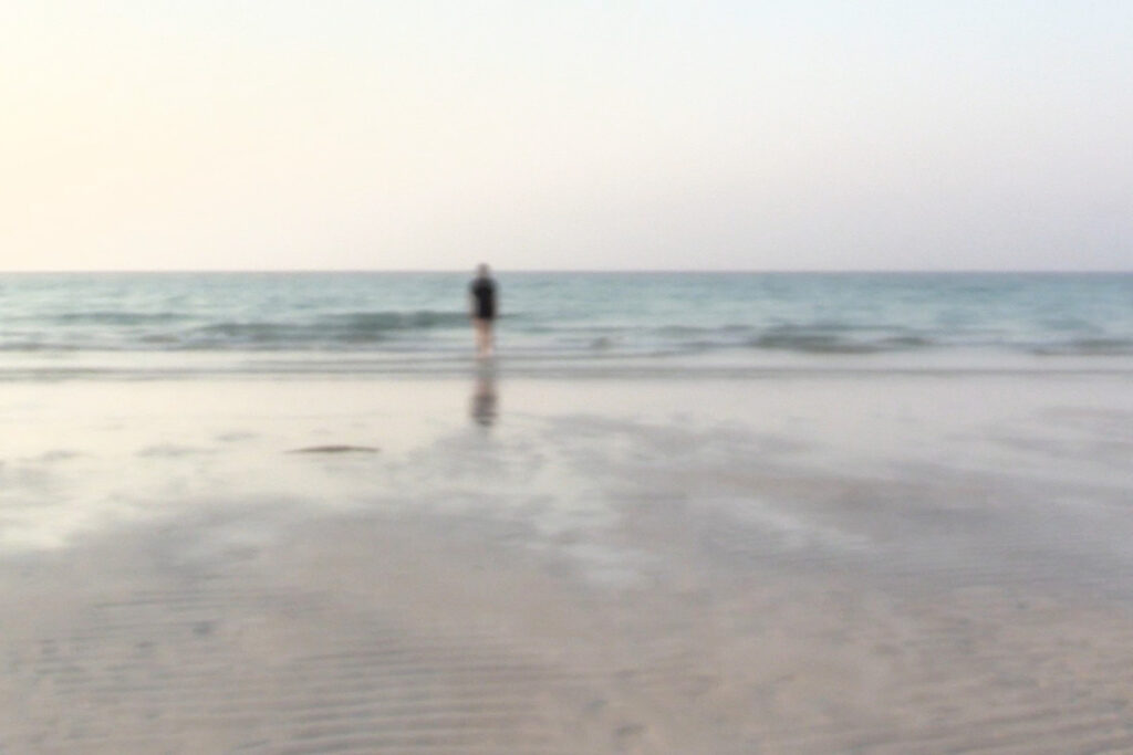 ここではすべてが渾然一体をなす。まず、ソンモの指示は音声に関わる。自分の作った曲をスマホから流し、波の音と混ぜてほしい。声、音楽、物音のすべての輪郭を曖昧にし、いっさいを混ぜ合わせることが目論まれている。そして、映像については、入水するソンモの姿はしだいに波と一体化してゆき、風景の中に埋没するまでが描かれる。黒い染みとなった人物の動きははたして遠ざかっているのか近づいているのかさえ判別しがたいほどだ。監督兼主演のソンモはアウトフォーカスによって視覚的に輪郭を失うばかりではなく、海の中に沈むことで生を全うし、作品だけを残して姿を消すことになる。虚構が現実となり、作者の死と引き換えに作品が誕生して生と死の境界すらなくなって、かくして作者と作品との一体化が成し遂げられる。