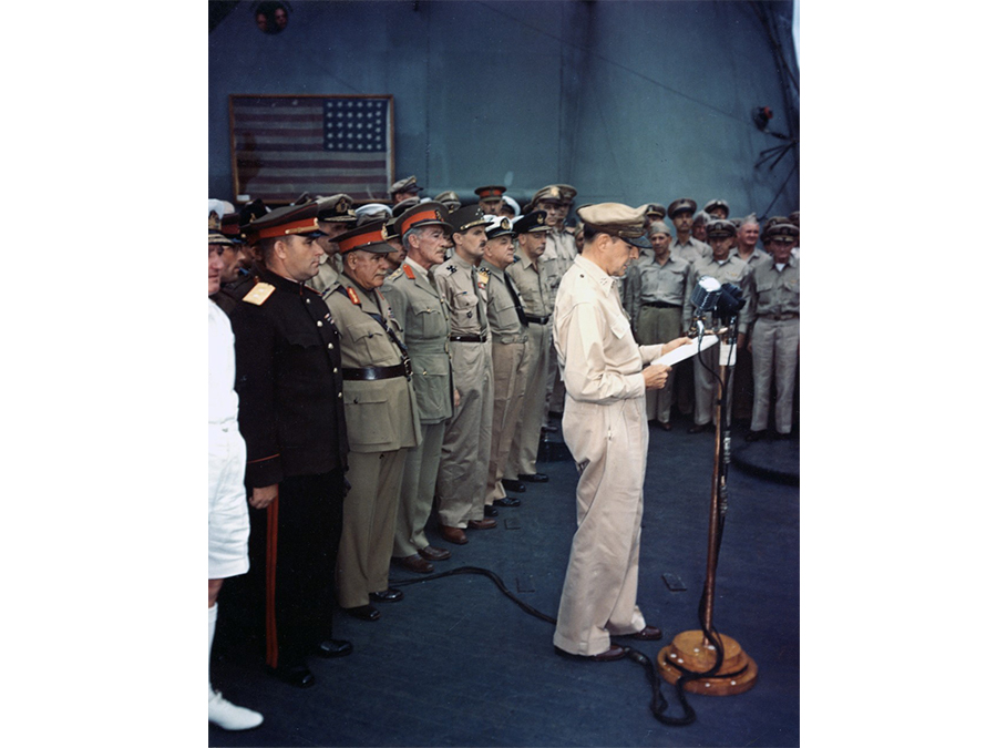 戦艦ミズーリ上での降伏文書の調印式。左奥に見えるのが来日したペリーの戦艦に掲げられていた星条旗である