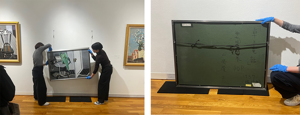 (左)壁から《卓上の電話》を外す様子 撮影:筆者