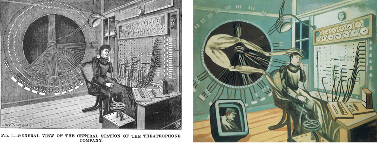 しかしもちろん、電話はあっという間に改良され、電信を凌駕していった。フランスでは、2回線を利用したステレオ(両耳で視聴できる[14])のオペラの通信装置「テアトロフォン」も導入された。人々はカフェやホテルのロビーにいながらにして、別会場で上演されているオペラを聴くことができた。これはいわば世界初の「ライブ配信」である。シュルレアリスムを日本に紹介した福沢一郎(1898年−1992年)は、パリからの帰国直前である1930年に《寡婦と誘惑》を制作しているが、この絵の主要な参照元となっているのはテアトロフォンのイラストであった。こことは異なる空間で生成している音声が、電信と配電盤を経由して「いまここ」へと接続されてしまう事態──「超現実的な」事態──は、シュールな夢物語ではなく、現に社会に実装された「過剰な現実」そのものといえる。コラージュという、ある領域において定着した意味を引き剥がし、別の平面へと移植する行為が、電信からテアトロフォンに至るケーブル装置においても、あるいは国家レベルの徴兵、収容、国外追放(亡命)においても共通して作動する権力であることに思い至るとき、シュルレアリスムは単なる技法以上の存在となる[15]。