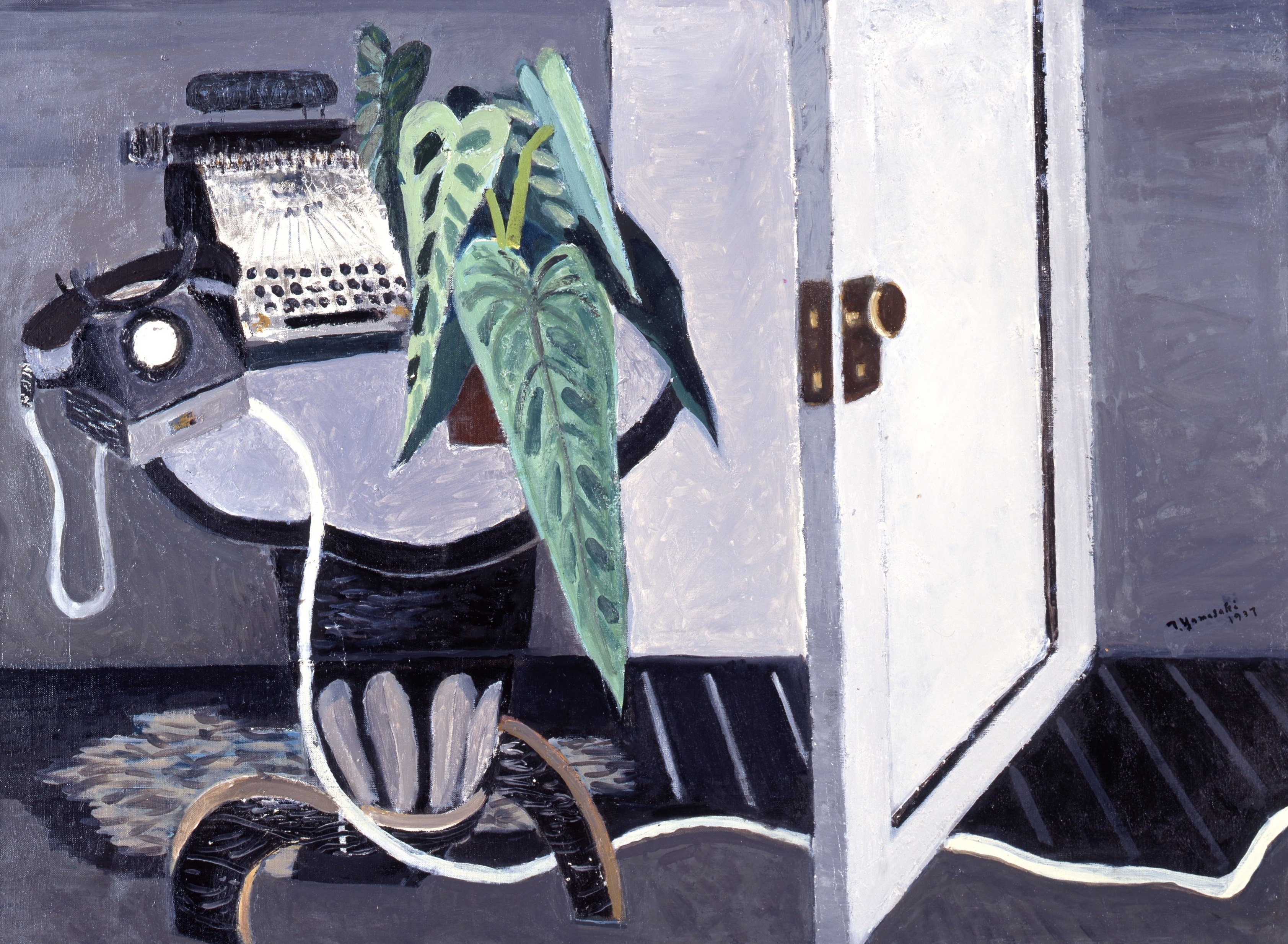 《卓上の電話》をみると、四角いブロックを隙間なく埋める形で構成された平面であることがわかる。そこに別のリズムを呼び込むかのように、黒電話、タイプライター、観葉植物[25]がテーブルいっぱいに所狭しと並び、電話からは白いコードが床に垂れ落ちている。普段使いでこのような状況は考えづらいから、山崎は意図的にこの3つを同じ卓上に配置している。「3号自動卓上電話機」と呼ばれる、いわゆる「黒電話」が国内で流通するのは1933年以降のため、1937年当時、この絵は最先端のメディアデバイスが油彩画という古色蒼然としたメディアに描かれている、という特殊な状況にあったといえよう[26]。少なくとも、銀行務めの山崎にとっては身近だったであろう黒電話も(タイプライターも観葉植物も)、鑑賞者たちにとっては高価で手が出せないものだったと考えられる。