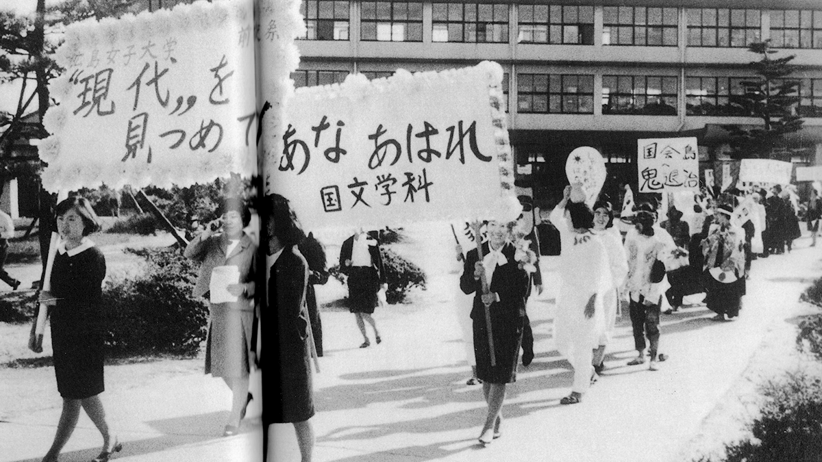 1967年の県立広島女子大学・大学祭のパレード。文学部・国文学科の宮迫は卒業論文で徒然草の研究をしているため、指導教官は園田均だと思われる。